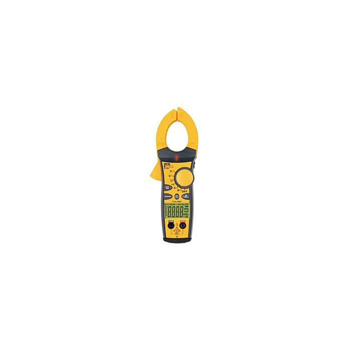 The Ideal Industries 61-765 digital clamp-meter is a true RMS sensing, manual- and auto-ranging multimeter for measuring current, voltage, capacitance, frequency, and resistance in electrical testing applications. It has a clamp that measures AC (alternating current) and DC (direct current) to 660A (amperes). The clamp has two jaws that can close around an electrical conductor up to 36mm (1.42 inches) in diameter to measure current without touching or interrupting the circuit. A set of test leads is included for measuring AC voltage to 750V, (DC voltage to 1,000V, capacitance to 1,000μF (microfarads), frequency to 400Hz (hertz), and resistance to 10,000Ω (ohms). Frequency can also be measured with the clamp. The meter has a rotary switch to select the property to measure, and both a front and a bottom 9,999-count LCD with a backlight for visibility in low light, that turns off automatically after three minutes. In addition to numerical readings, the front display shows readings on a 41-segment bar graph. The bottom display shows AC and DC current readings when taking measurements in tight spaces.