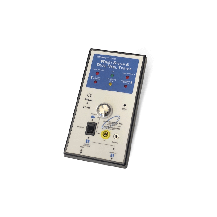 The Static Solutions CT-8700 Ohm-Stat Wrist Strap/Heel Grounder Tester Kit tests wrist straps and heel grounders individually and simultaneously in just seconds.  No need to switch flipping or foot changing allowing for easy and simple testing.