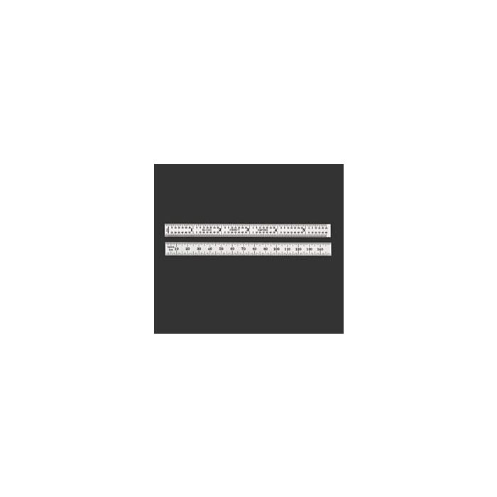 • Length (in) 5-3/4" Length (mm) 150mm Graduation Type 31 Graduations 32nds and 64ths on One Side; mm and 1/2mm on Reverse. All Four Edges Graduated from Same End Finish Satin Chrome Style English/Metric Rule Construction Full-Flexible Steel Thickness (mm) 0.4mm Width (mm) 12mm
