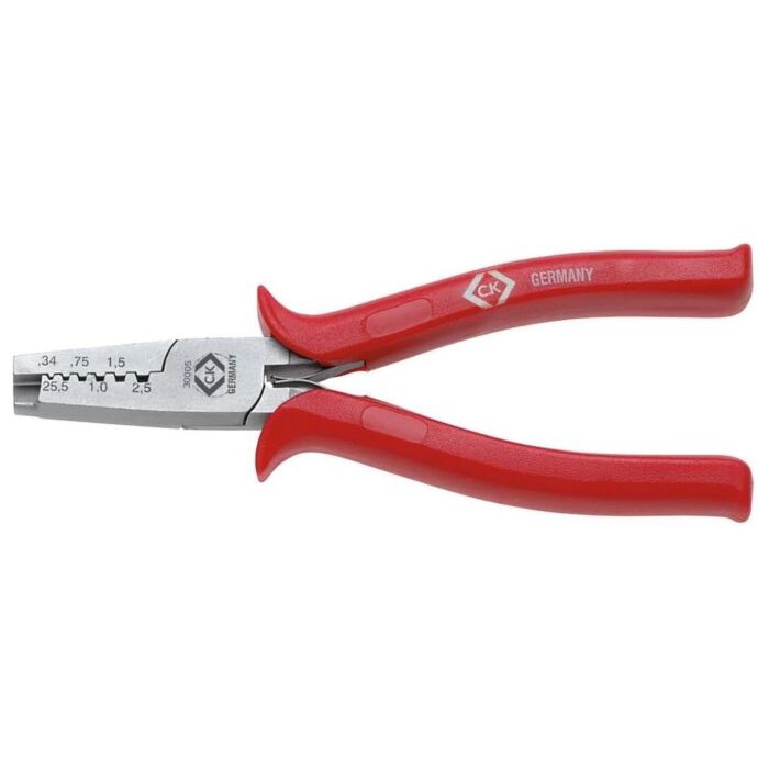 C.K Small Ferrules Crimping Plier is designed for the safe and secure crimping of boot lace ferrules. Hardened and tempered high alloy carbon steel for increased strength and durability. Matt chrome plated for corrosion protection. Contoured grips with anti-slip horns for comfort and safety. Capacity: 0.25 - 2.5 mm square/AWG 23 - 13.