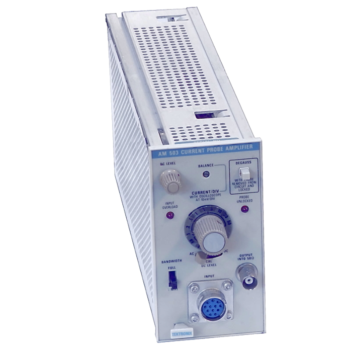 The AM503 Current Probe Amplifier allows display of current on any oscilloscope having 10 mV/div sensitivity, 50 ohm or 1 megohm input, and at least 100 MHz bandwidth. It is compatible with A6302, A6303, P6302, P6303 current probes. It requires a TM500 or TM5000 series mainframe for operation.