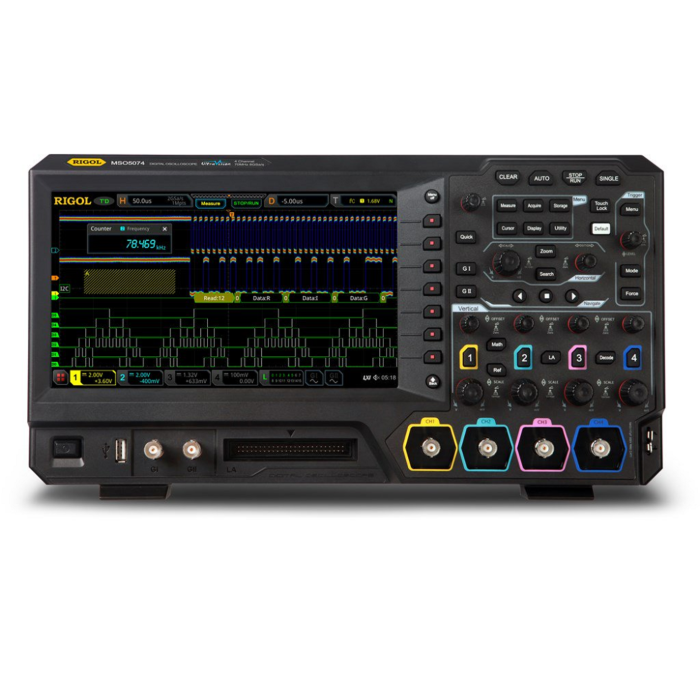 The Rigol MSO5000 series digital oscilloscope is a high performance instrument based on Rigol’s UltraVision II technology. With a real time sample rate of up to 8 GSa/s and extremely high memory depth, the MSO5000 seamlessly integrates 7 instruments into one - oscilloscope, logic analyzer, spectrum analyzer, arbitrary waveform generator and much more. The MSO5000 also features a 9 inch, capacitive multi touch screen with 256 level intensity grading and color persistence.