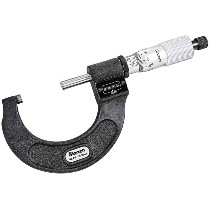 The Starrett 216M Digital Micrometer is a mechanical digital micrometer – simple to use even by the inexperienced. The anvil and spindle are sized at .250" (6.35mm). 50mm, 0.001mm Grad, Carbide Faces, Ratchet Stop, Lock Nut.