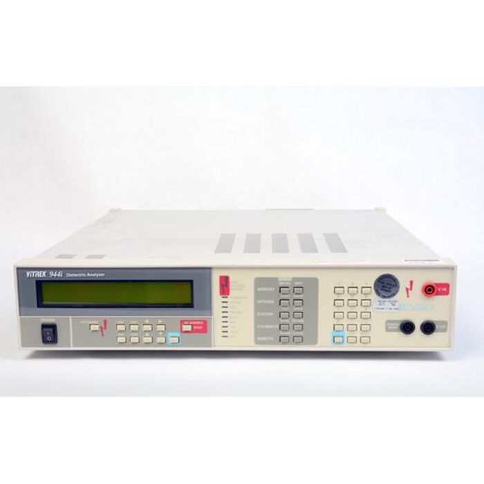 The Vitrek 944i combines AC dielectric strength testing (AC Hipot) with DC dielectric strength testing (DC Hipot), insulation resistance (to65 Gigohms) and earth continuity measurement all in one feature-rich automated instrument. This compact dielectric analyzer lets you measure four electrical safety test parameters from a single test connection-all with the touch of a button.